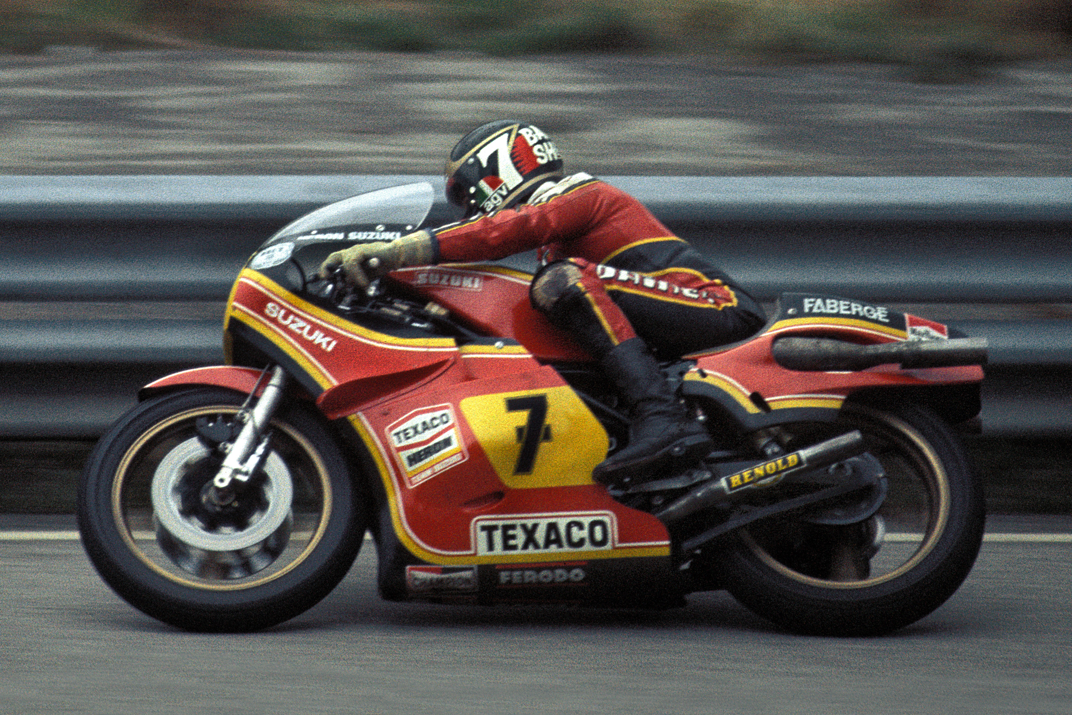 The cheeky Londoner took the title in 1976 and ’77, winning 11 GPs, reward for often painful times with the first Suzuki 500 square-four “XR14” racer in 1974.